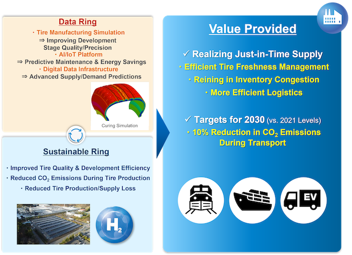 SRI is promoting enhancement to the supply/demand forecast and optimization of the logistics system, by improving the product precision and productivity by means of the “Tyre Manufacturing Simulation,” wider use of AI and IoT platforms, and establishment of the digital data infrastructure on a global basis. We will also work on enhancement of the R&D efficiency with utilization of the simulation and reduction of the CO2 emissions by utilizing the solar light and hydrogen as energy for manufacturing. With these means for enhancement of production efficiency and saving of resources, we seek to achieve the just-in-time supply system and a 10% cut in CO2* emissions during transportation.