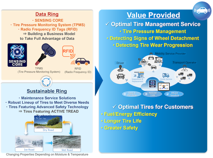 SRI is building a system for providing the optimal tire solution service that contributes to the driving safety of the customers, through the data obtained while the car is running with the help of the proprietary "SENSING CORE", tire pressure monitoring system, and non-contact radio frequency identification tags. We will provide optimal proposals about tires including the maintenance services and tires with the active tread technology, one of the technologies of the new technology development concept “SMART TYRE CONCEPT.” With these, we will provide products with improved energy saving performance, longer life and enhanced safety.
