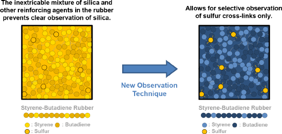 The rubber used in automobile tires is made up of dozens of different types of materials, including polymers such as natural and synthetic rubber, reinforcing agents such as carbon and silica and so forth. These various materials form complex, hierarchical structures within the rubber. And so, in order to improve overall tire performance, it is thus necessary to gain a clearer understanding of these hierarchical structures by observing the structures of each of the materials that make up tire rubber in isolation. In particular, the structures formed by sulfur cross-links, which give rubber its elasticity, have long been thought to be closely related to rubber strength and changes in rubber properties over time (such as degradation) as well. However, up until now, the details of these structures within rubber have remained shrouded in mystery.
