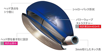 | | クラウン部を薄肉・軽量にしただけでなく、ソールのトウ・ヒール方向をフラット化。シャローバック形状とネックを短くしたことで、さらに深・低重心となり、上がりやすく大きなキャリーを実現しました。「ゼクシオ ナイン レディス」(#5/L)に対して2.5ヤード*の飛距離アップを実現しています。 |