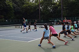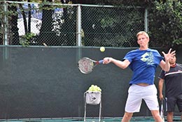 | 第2部「イリ・ベセリ選手によるテニスレッスン会」では、ベセリ選手の得意なバッグハンドの練習を行いました。ベセリ選手は参加したジュニア全員とヒッティング。子供たちはとても嬉しそうに、真剣に練習に取り組んでいました。 |