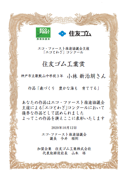 住友ゴム工業(株)は、当社が加盟するエコ・ファースト推進協議会主催の『第11回「エコとわざ」コンクール』で、住友ゴム賞を選出し、11月25日(水)にオンラインで住友ゴム賞の表彰を行いました。今回の住友ゴム賞には、イメージのわきにくい森と海の密接な繋がりを端的に分かりやすく表現した、兵庫県神戸市立歌敷山中学校3年の小林新治朗さんの作品「森づくり 豊かな海も 育ててる」が選ばれました。