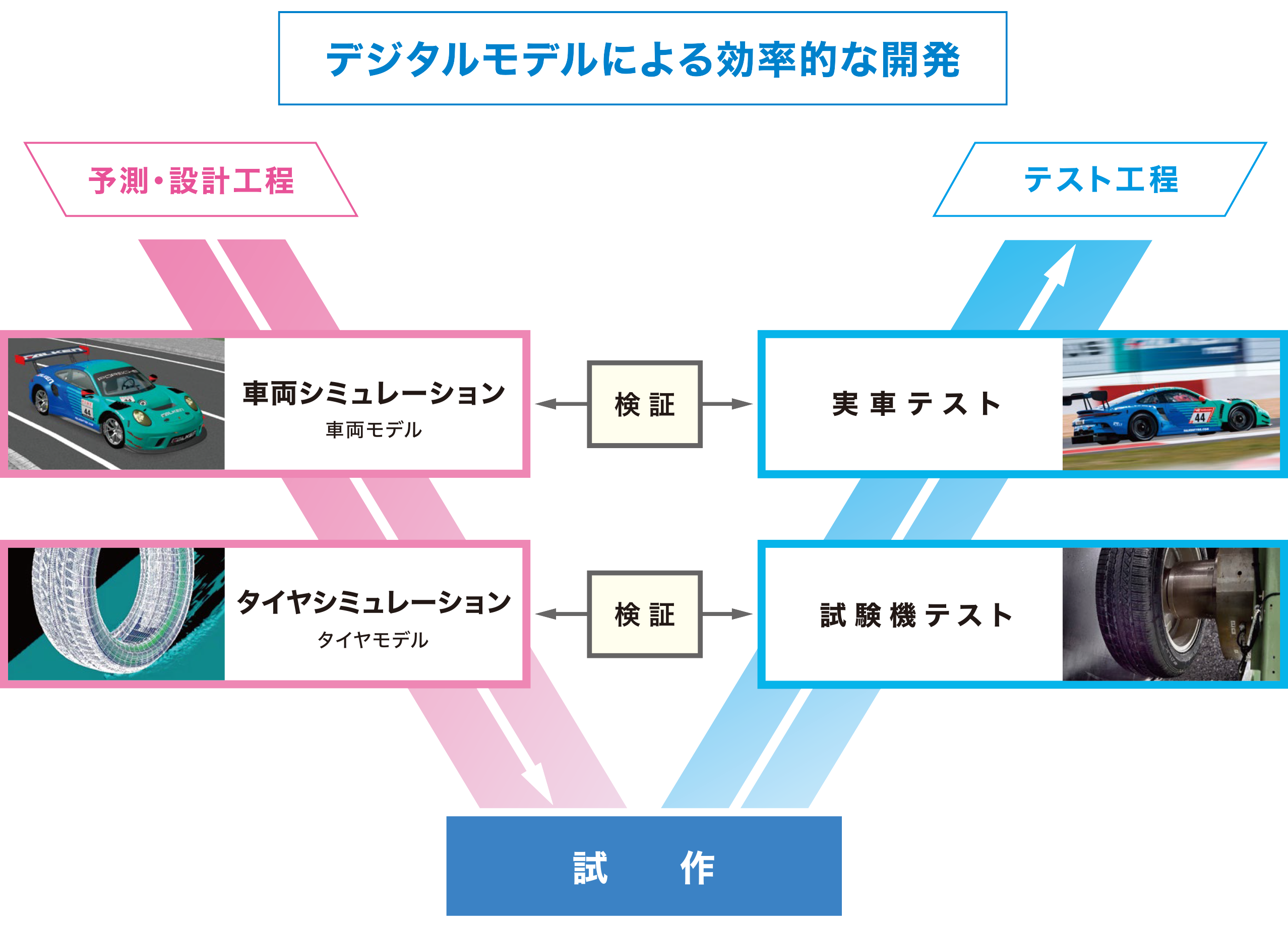 本年は、FALKENモータースポーツチームが使用するポルシェを新調し、新型「Porsche 911 GT3R(992)」2台体制で参戦します。まだ走行実績のない新車に合わせたタイヤを開発するにあたり、当社の進化させたモデルベースタイヤ開発技術が力を発揮しました。車両のデジタルモデルと目指す性能のタイヤのデジタルモデルを作成し、それをベースにシミュレーションを行います。その結果、試作をする前にタイヤの仕様を絞りこむことができるようになりました。デジタルモデルを利用した予測・設計工程を繰り返し行うことで、試験機によるテストや実車テストの工程が削減可能となり、開発の効率化や試作タイヤの削減を実現しました。