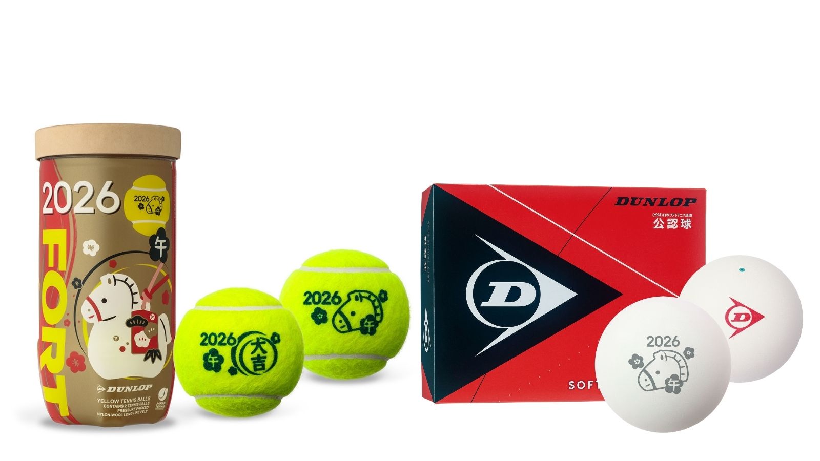 住友ゴムグループの(株)ダンロップスポーツマーケティングは、来年の干支である「午」のイラストと「2026」の文字をプリントした硬式テニスボール「ダンロップ フォート 干支ボール(2026年「午」)」(2球入/ペット)および、「ダンロップソフトテニスボール(公認球)干支ボール」を2025年11月24日から数量限定で販売します。