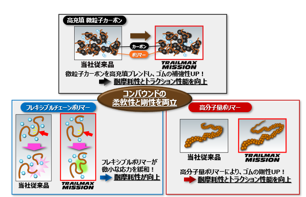 フロント/リアに専用ブレンドしたフルカーボン配合を採用。ロングツーリングにも耐えうるライフ性能と、オフロードでのトラクション性能を強化しました。