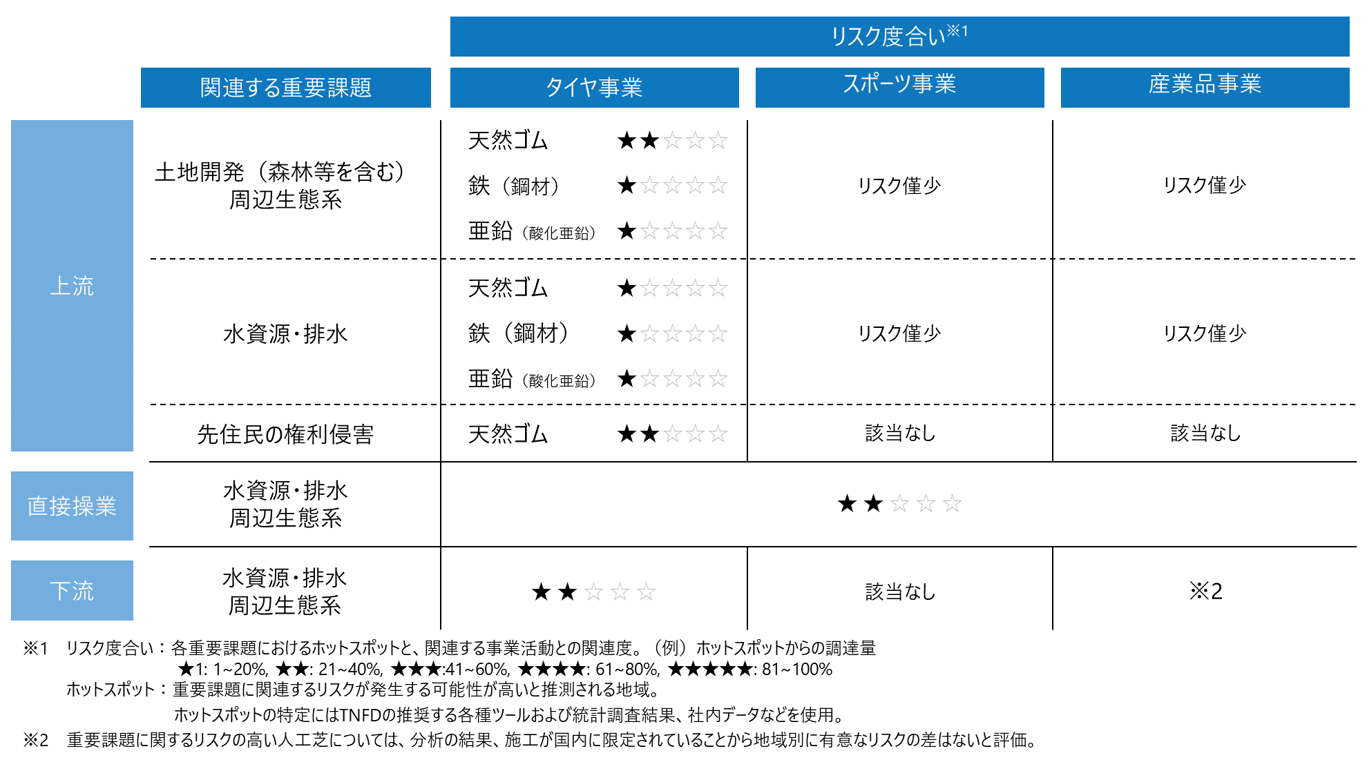 2023年は、タイヤ事業において、TNFD提言で推奨されている手法を用いてリスク評価を実施しましたが、さらなる生物多様性保全の推進に向け、このたび、スポーツ事業と産業品事業にも対象範囲を広げ、リスク評価を行いました。