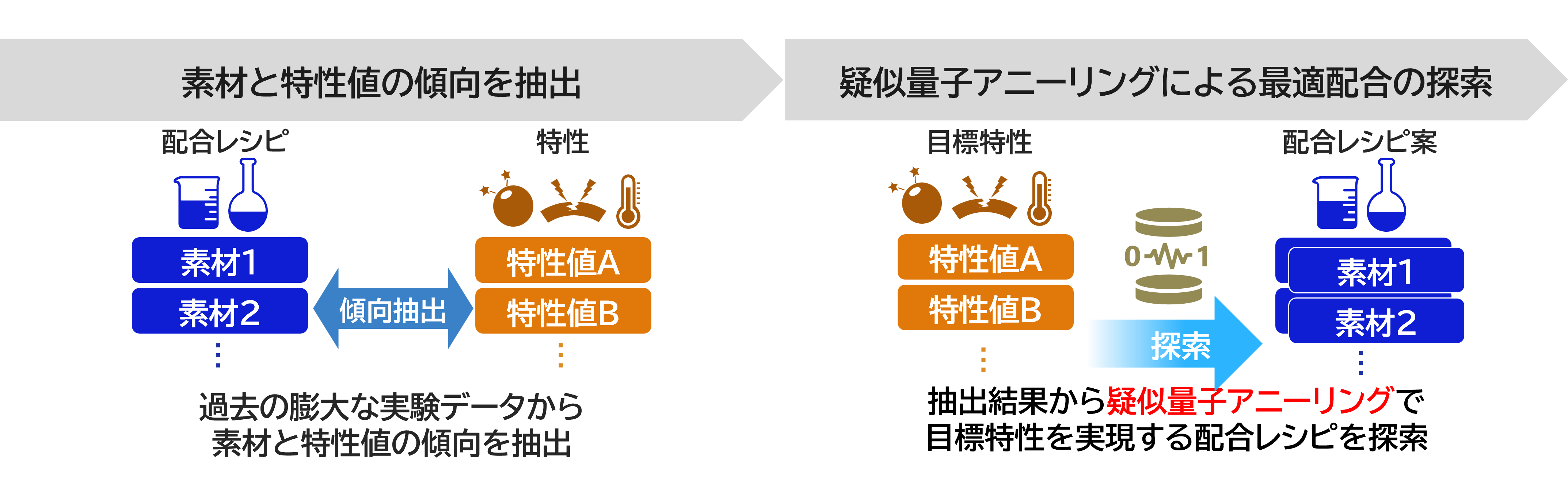 本実証ではまず、住友ゴムの有する過去の実験データから、素材の種類と配合量が材料特性に与える傾向を分析・抽出しました。次に、抽出した本傾向をもとに、膨大かつ複雑な組み合わせの中から高速に最適解を導くことが可能なNECの疑似量子アニーリング技術を活用して、目標とする特性を満たす素材の種類と配合候補を網羅的に探索しました。