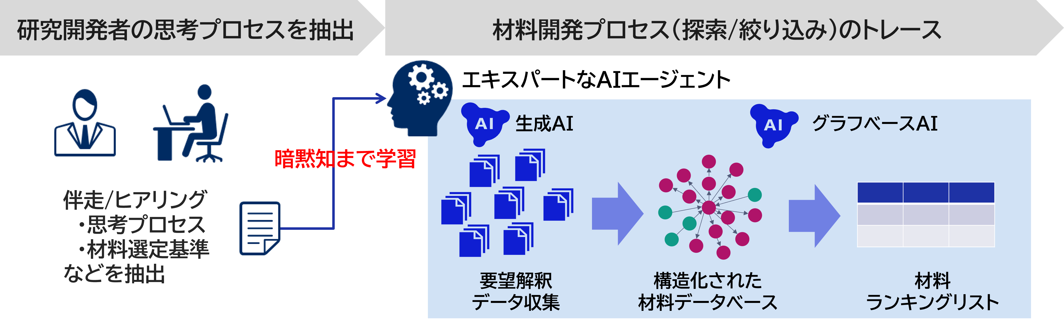 本実証では、高度な性能が求められるプレミアムタイヤの新たな材料探索を目的に、AIに関する知見が豊富なNECの研究者が住友ゴムの材料開発者と共創し、材料探索における思考プロセスや暗黙知を抽出して、それらを学習させたAIエージェントを構築しました。そして、本AIエージェントが、生成AIとグラフベースAI(注6)を組み合わせた材料探索ソリューションを活用し、材料候補の絞り込みを行いました。