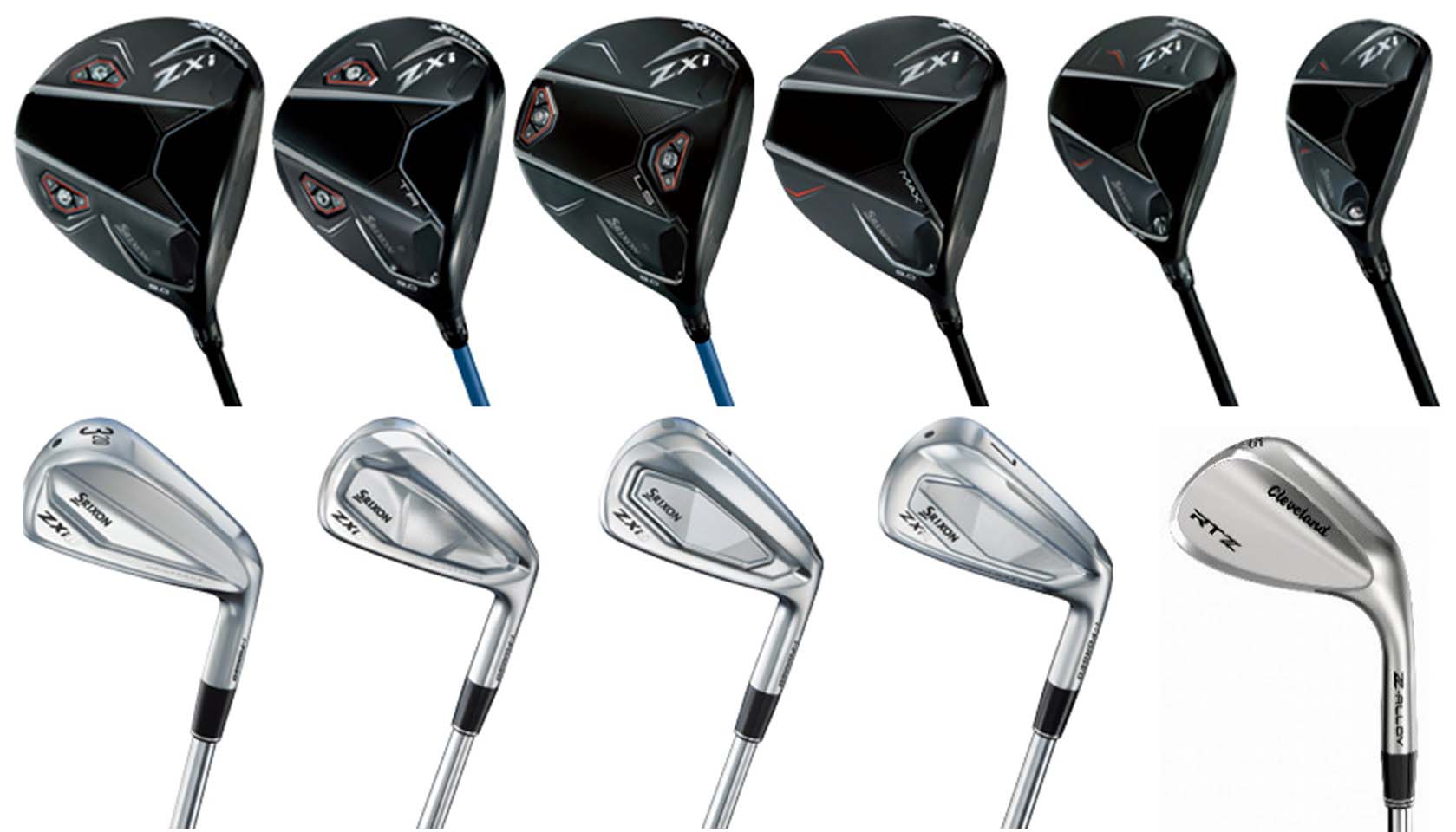 写真二段目 左から、「スリクソン ZXiU ユーティリティ」、「スリクソン ZXi7 アイアン」、「スリクソン ZXi5 アイアン」、「スリクソン ZXi4 アイアン」、「クリーブランドゴルフ RTZ ウエッジ」