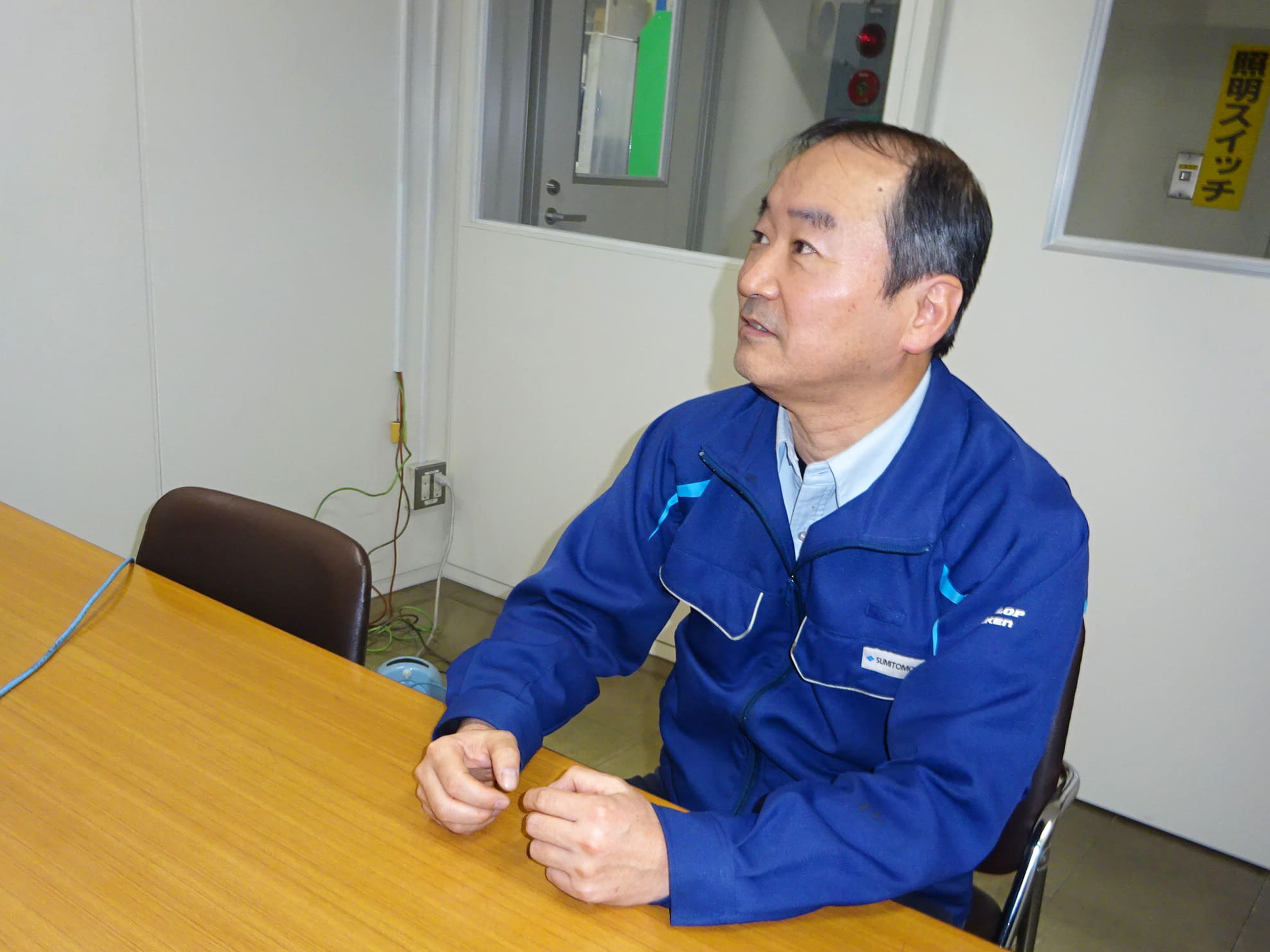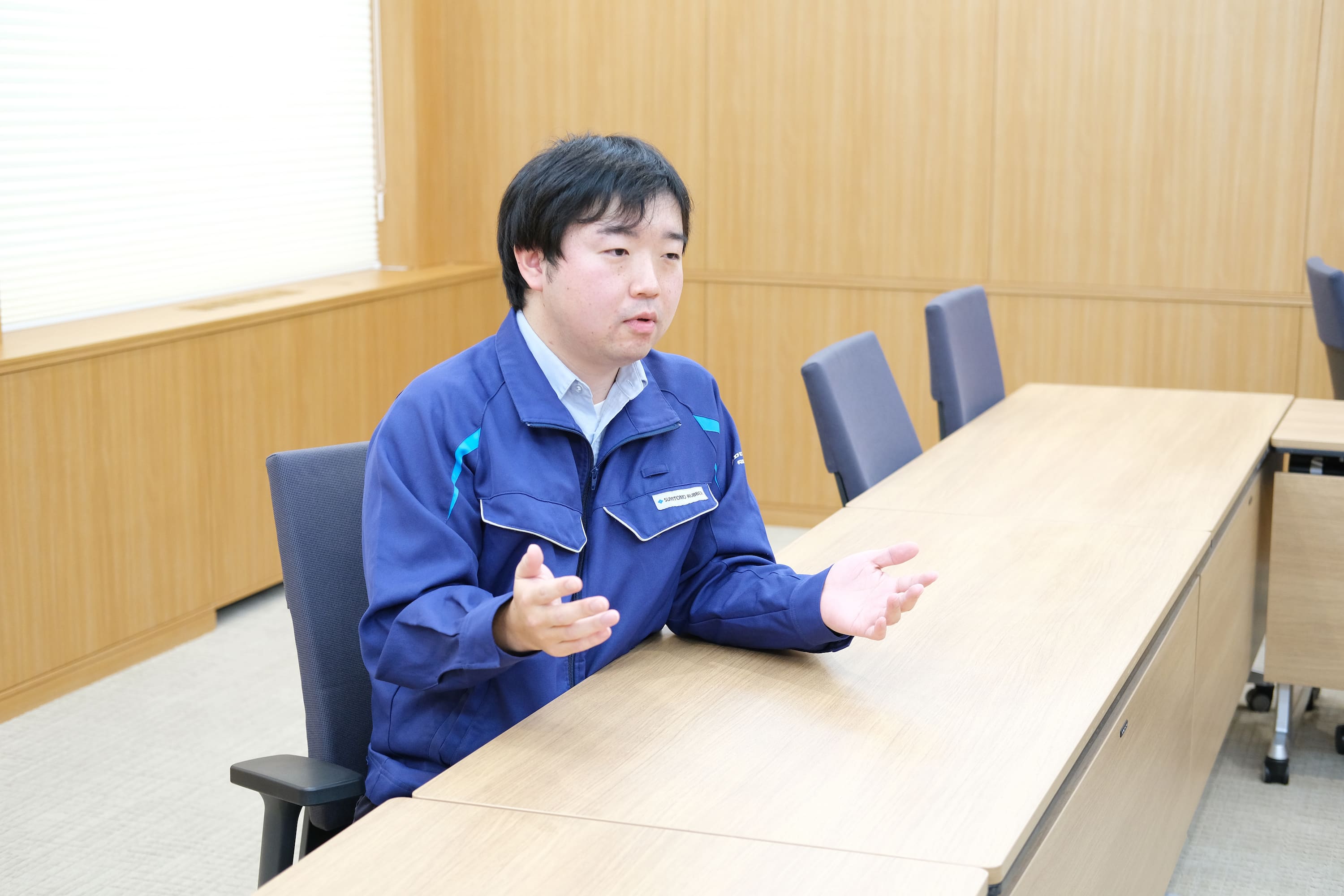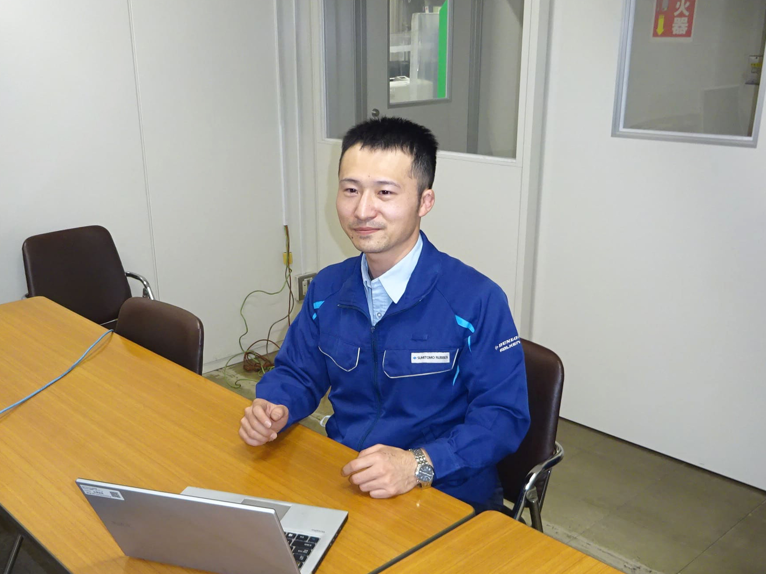 K.T.は2022年7月に立ち上がった工場内の環境管理課でプロジェクトをリード。実証実験における主任研究員の立場でもあり、スケジュール管理や各部署からの意見の集約・調整といった実証実験全体を取りまとめる役割を担い、水素エネルギーの導入を推進している。「最初からすべての燃料を水素エネルギーに代替することはできません。今回の実証実験では、住友ゴムの最新タイヤ製造システム「NEO-T01*2」の加硫工程に水素エネルギーを活用しています。工場で使う燃料の数パーセントを水素エネルギーでカバーするものですが、未来につながる技術を得るための最初の一歩です。まだ誰も実現したことのない、最先端の技術を確立するためのチャレンジに、年甲斐もなく毎日ワクワクしています。これまでの経験を活かし、設備導入のアドバイスを行っていますが、若手社員から出てくる柔軟なアイデアから学ぶことも多く、いい刺激を受けています」。
